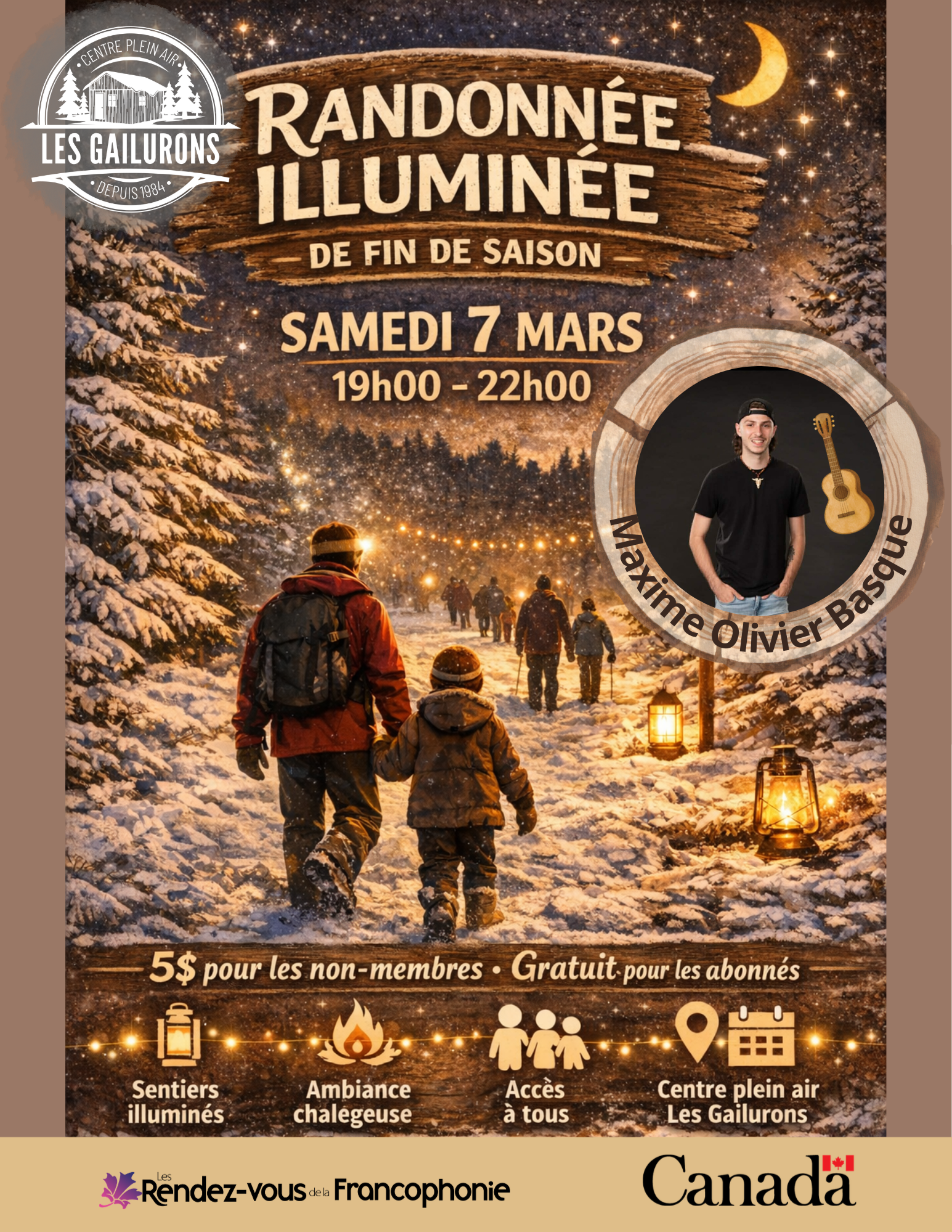 Centre plein air Les Gailurons 202 Rivière Du Portage Rd, Haut-Rivière-du-Portage, Nouveau-Brunswick, CanadaRandonnée illuminée au Centre plein air Les Gailurons Viens vivre une expérience magique en nature alors que la nuit tombe Équipé·e de ta lampe frontale, pars en randonnée sur nos sentiers illuminés et profite d’une ambiance chaleureuse et féérique. Idéal pour tous les niveaux et pour les familles. Présence musicale de Maxime Olivier Basque (finaliste […]
