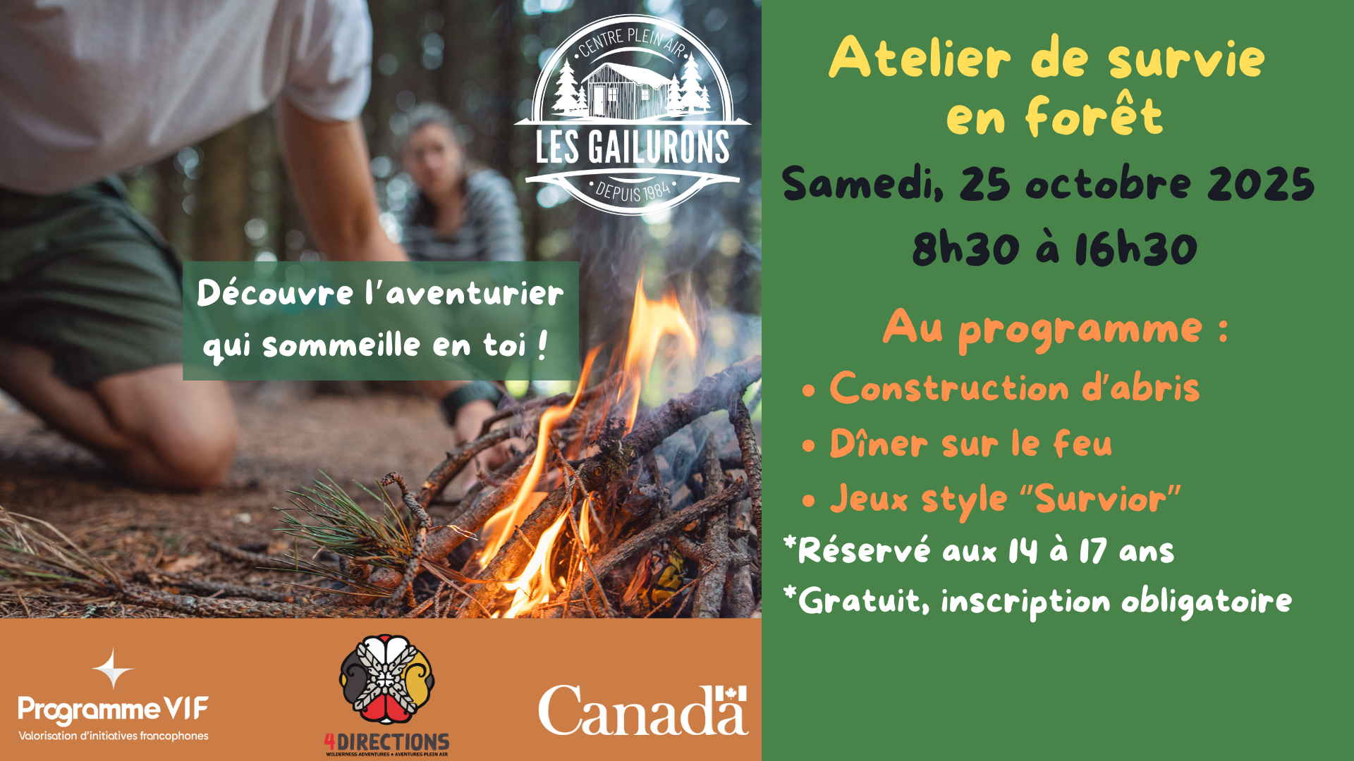Centre plein air Les Gailurons 202 Rivière Du Portage Rd, Haut-Rivière-du-Portage, Nouveau-Brunswick, CanadaEnvie de sortir de ta zone de confort? Viens passer une journée complète en nature pour apprendre les bases de la survie : Construire un abri Allumer et entretenir un feu Cuisiner ton repas (déjeuner + dîner) sur le feu Trucs et astuces de survie pour t’adapter en forêt Samedi 25 octobre 2025 8h30 à […]