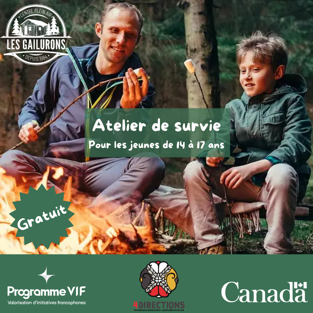 Centre plein air Les Gailurons 202 Rivière Du Portage Rd, Haut-Rivière-du-Portage, Nouveau-Brunswick, Canada𝐏𝐫𝐞̂𝐭.𝐞 𝐚̀ 𝐭𝐞𝐬𝐭𝐞𝐫 𝐭𝐞𝐬 𝐬𝐤𝐢𝐥𝐥𝐬 𝐝𝐞 𝐬𝐮𝐫𝐯𝐢𝐞? Le 11 octobre, viens vivre une 𝐣𝐨𝐮𝐫𝐧𝐞́𝐞 𝟏𝟎𝟎% 𝐟𝐨𝐫𝐞̂𝐭 avec nous! Au programme : Construire ton propre abri Allumer et gérer un feu Cuisiner ton déjeuner + dîner directement sur le feu Découvrir plein d’astuces de survie 𝐒𝐚𝐦𝐞𝐝𝐢 11 𝐨𝐜𝐭𝐨𝐛𝐫𝐞 8h30 à 16h30 Réservé aux jeunes de 14 […]