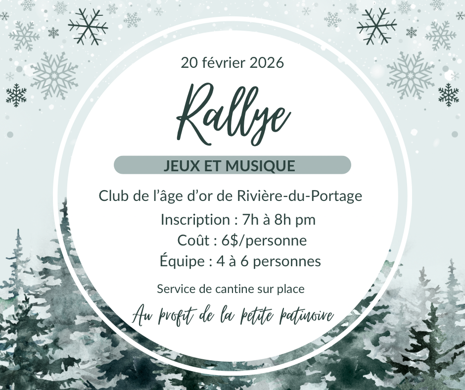 Conseil récréatif de Haut-Rivière-du-Portage 82 Rivière-du-Portage Sud, Haut-Rivière-du-Portage, NB, CanadaRallye sur papier : jeux et musique Équipe : 4 à 6 personnes Service de cantine sur place Le tout au profit de la petite patinoire de Haut-Rivière-du-Portage Prix d'entrée de votre évènement: 6$/personne